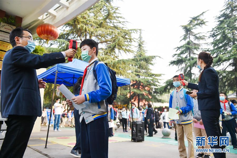 5月6日,河南省洛阳市涧西区英语学校复学学生排队测量体温。 新华社发(黄政伟 摄)