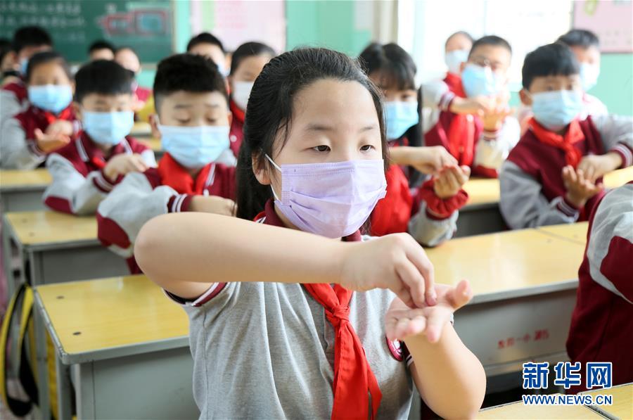 5月6日,洛阳市汝阳县实验小学四年级一班的学生在“开学第一课”上学习洗手消毒方法。 新华社发(康红军 摄)