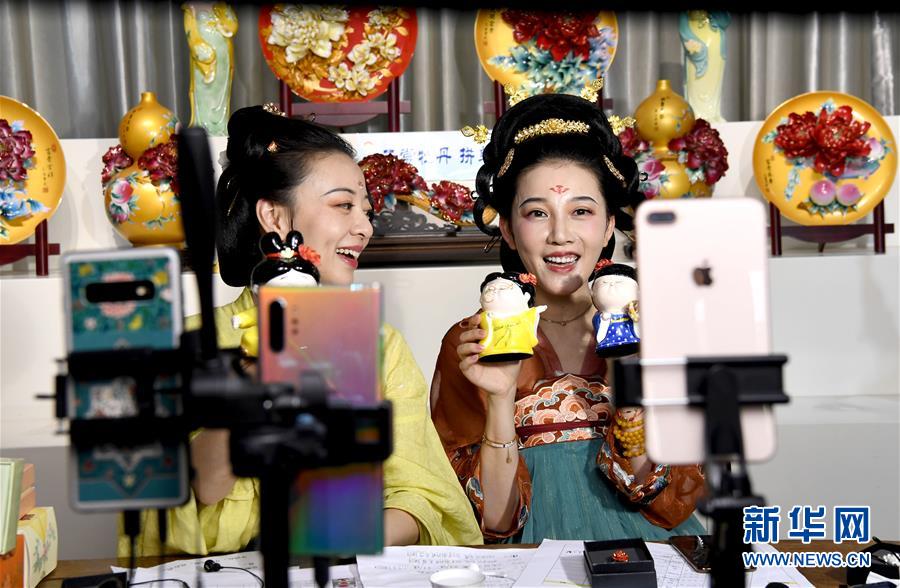 在洛阳李学武牡丹瓷园,主播通过直播的方式推荐牡丹瓷(4月26日摄)。新华社记者 朱祥 摄