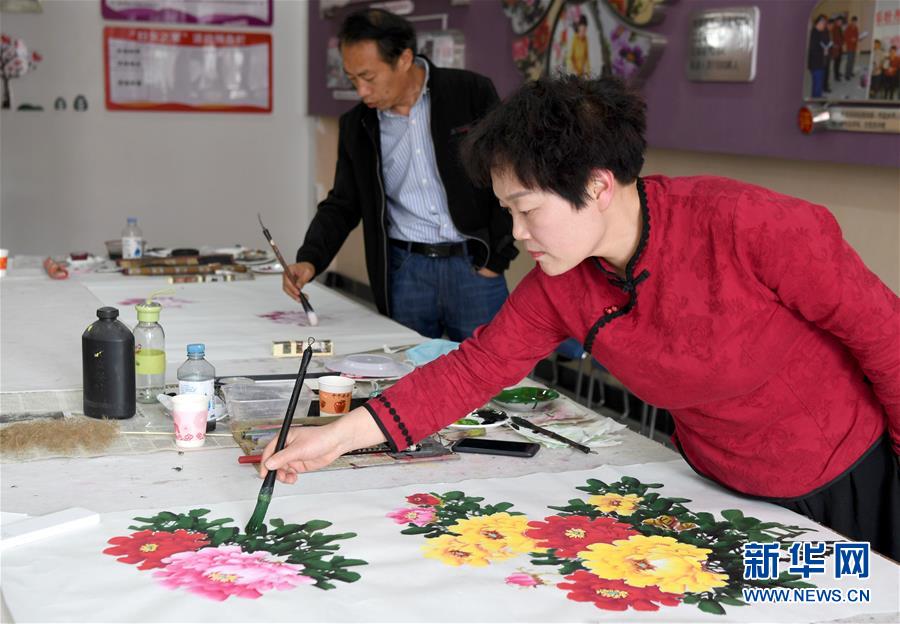 洛阳市孟津县平乐村农民画家徐均霞(右)在创作牡丹画(4月27日摄)。新华社记者 朱祥 摄
