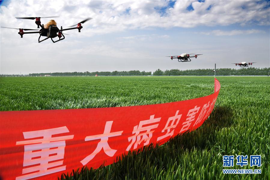 5月7日,在山东青岛平度市蓼兰镇胜利村,植保无人机在进行小麦条锈病防治喷洒作业。 新华社记者 李紫恒 摄