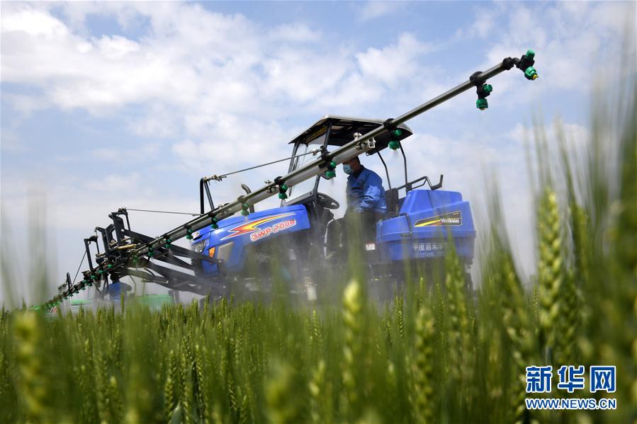 5月7日,在山东青岛平度市蓼兰镇胜利村,喷杆喷雾机在进行小麦条锈病防治喷洒作业。 新华社记者 李紫恒 摄