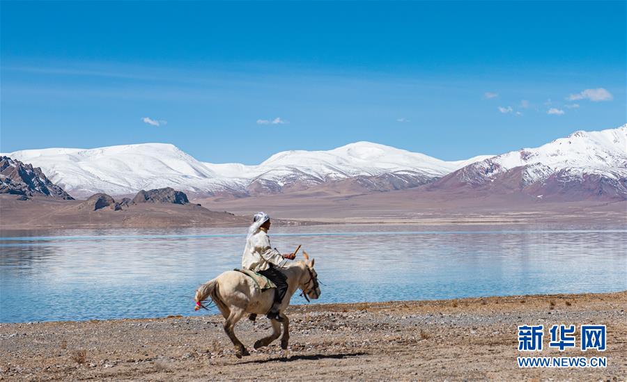 村民在西藏那曲市尼玛县当穹错旁骑马飞驰(4月30日摄)。新华社记者 侯捷 摄