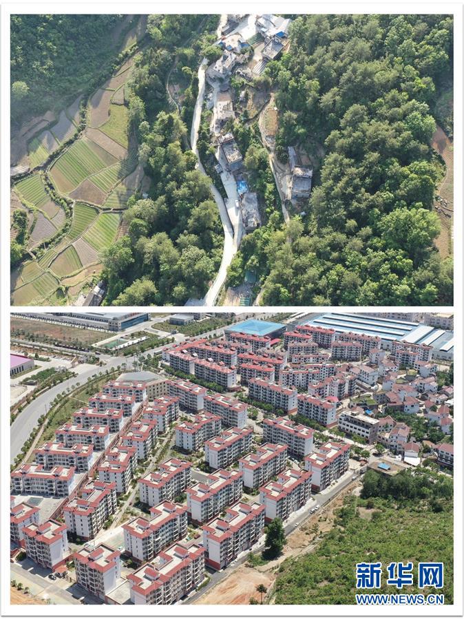 这是一张拼版照片,上图为:罗应和搬迁之前居住的贵州惠水县摆金镇斗底村一角(5月6日摄,无人机照片);下图为:罗应和搬迁之后居住的惠水县明田街道新民社区一角(5月6日摄,无人机照片)。新华社记者 欧东衢 摄