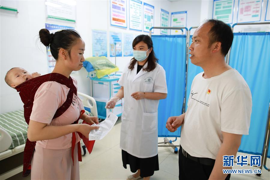 罗应和(右)在贵州惠水县的“移民社区医院”内与群众交谈(5月6日摄)。新华社记者 欧东衢 摄