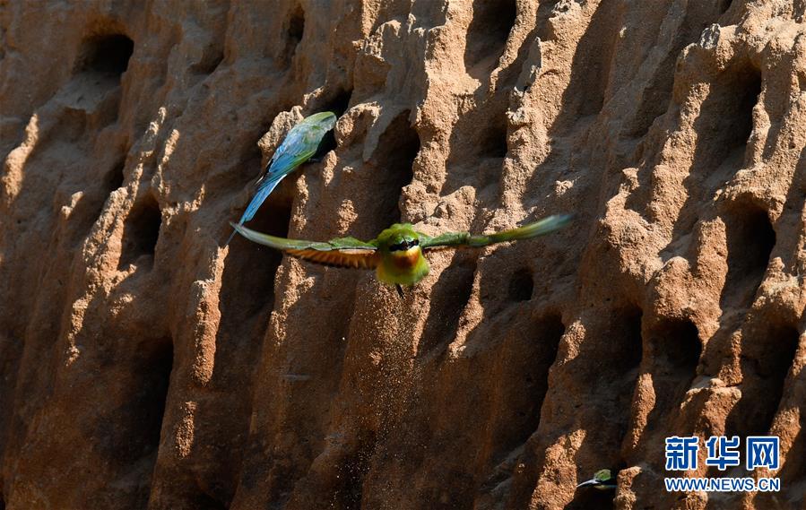 在海口五源河下游蜂虎保护小区,栗喉蜂虎在沙质土坡上起飞(5月7日摄)。新华社记者 杨冠宇 摄