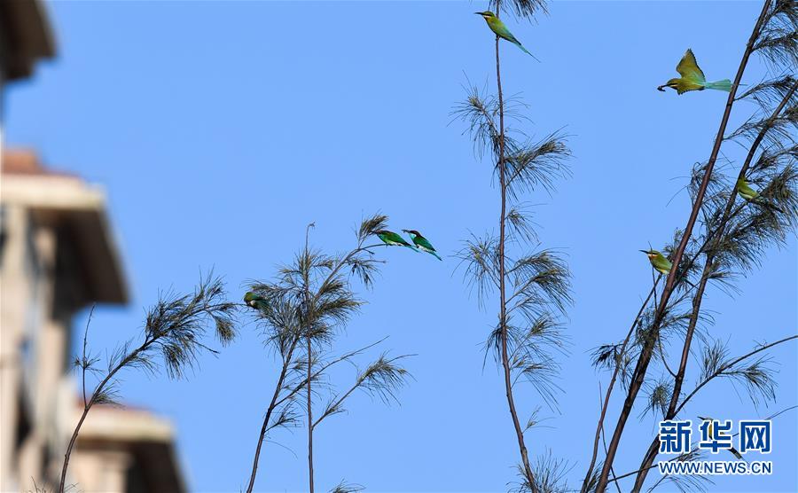 5月8日,在海口五源河下游蜂虎保护小区,栗喉蜂虎和蓝喉蜂虎在树枝上休息。新华社记者 杨冠宇 摄