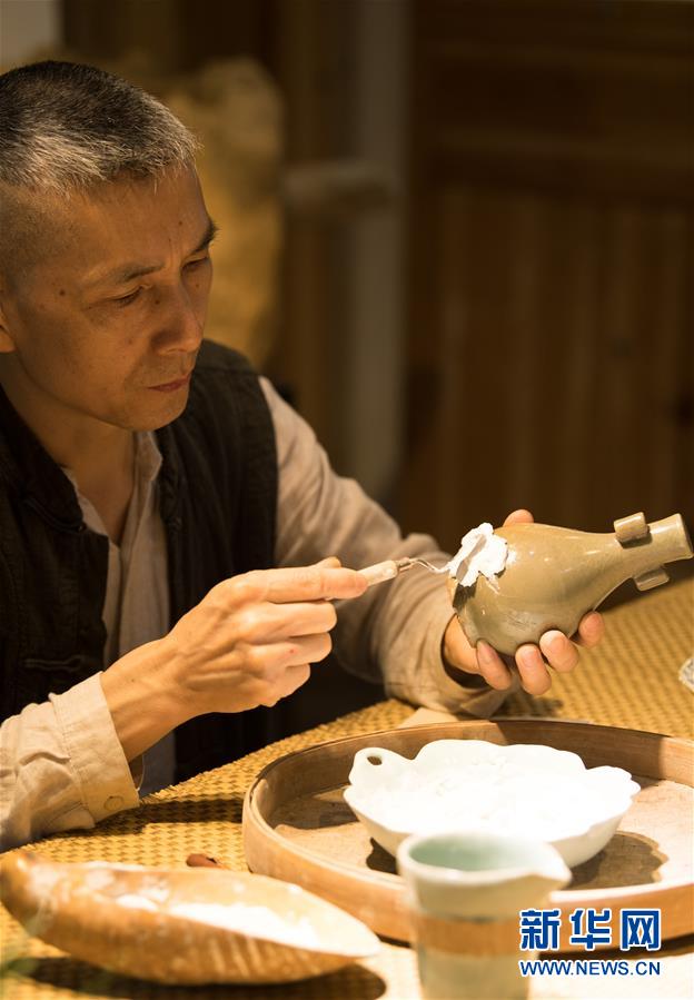 5月8日,项宏金在龙泉青瓷装饰纹样研究所修复古瓷器。 1965年出生的项宏金,被浙江龙泉年轻一代瓷人称为“项哥”,他从20世纪90年代开始收集龙泉青瓷标本,研究青瓷纹样。2014年出版著作《龙泉青瓷装饰纹样》,次年开设龙泉青瓷装饰纹样研究所,将自己收藏的千余件标本跟瓷器爱好者、创作者免费分享。 新华社记者 翁忻旸 摄