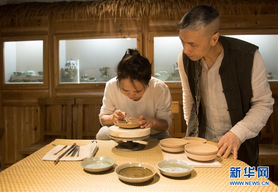 5月8日,“90后”瓷人汤佳(左)在龙泉青瓷装饰纹样研究所对着项宏金收藏的古瓷器刻划鱼纹盘。 1965年出生的项宏金,被浙江龙泉年轻一代瓷人称为“项哥”,他从20世纪90年代开始收集龙泉青瓷标本,研究青瓷纹样。2014年出版著作《龙泉青瓷装饰纹样》,次年开设龙泉青瓷装饰纹样研究所,将自己收藏的千余件标本跟瓷器爱好者、创作者免费分享。 新华社记者 翁忻旸 摄