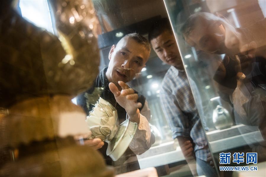 5月8日,项宏金(左)在龙泉青瓷装饰纹样研究所向来访的年轻瓷人介绍两件莲瓣纹作品的细节。 1965年出生的项宏金,被浙江龙泉年轻一代瓷人称为“项哥”,他从20世纪90年代开始收集龙泉青瓷标本,研究青瓷纹样。2014年出版著作《龙泉青瓷装饰纹样》,次年开设龙泉青瓷装饰纹样研究所,将自己收藏的千余件标本跟瓷器爱好者、创作者免费分享。 新华社记者 翁忻旸 摄