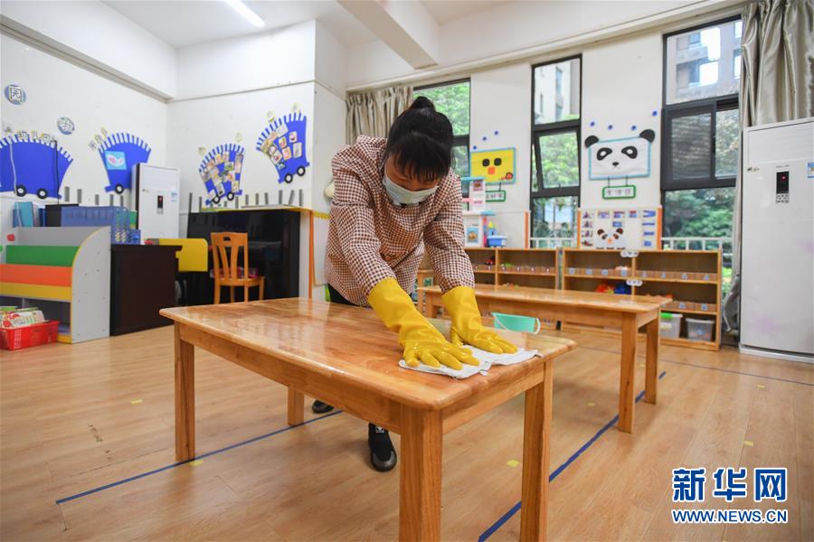 5月8日,在长沙市岳麓幼儿教育集团第二幼儿园,工作人员对桌子进行清洁消毒。 近日,长沙市各幼儿园为开园做准备,提前清洁消毒和布置教室,部分幼儿园进行开园的模拟演练。长沙市的幼儿园开园起始时间为5月11日,全市幼儿园在5月15日前完成开园。 新华社记者陈泽国摄