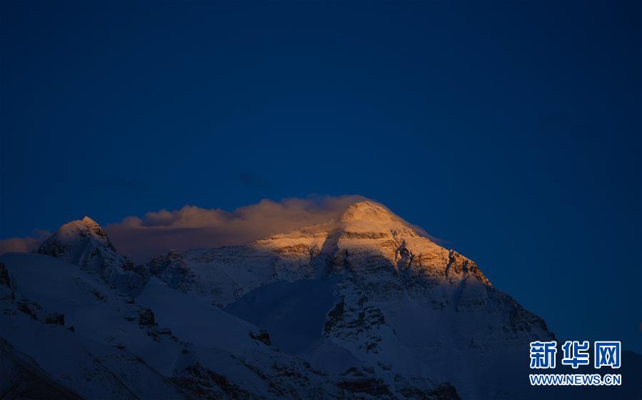 这是5月3日拍摄的夕阳下的珠峰。 世界第一高峰珠穆朗玛峰终年积雪,顶峰云雾缭绕,美不胜收。 新华社记者 多吉占堆 摄