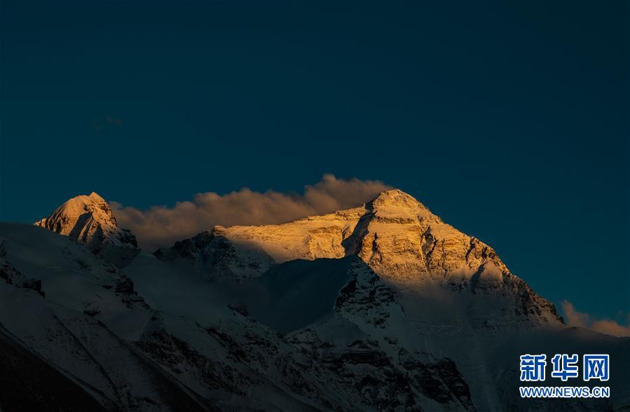 这是5月3日拍摄的夕阳下的珠峰。 世界第一高峰珠穆朗玛峰终年积雪,顶峰云雾缭绕,美不胜收。 新华社记者 晋美多吉 摄