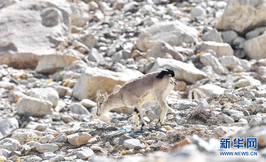 黄嘴山鸦停在岩羊背上(5月8日摄)。 当日,一群岩羊在珠峰大本营周围觅食,黄嘴山鸦飞到岩羊身上停留,构成一幅幅生动有趣的雪域图画。 新华社记者 普布扎西 摄