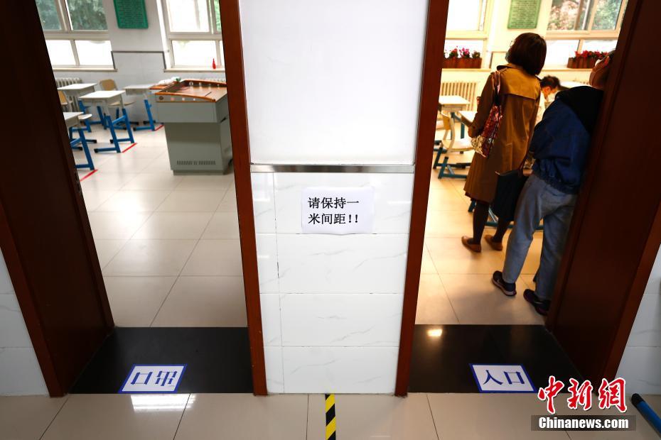 5月8日,北京市陈经纶中学(本部初中)老师们在学校检查各项防疫措施,做好开学准备工作。北京市8.42万余名初三学生将于5月11日重返校园。中新社记者 富田 摄