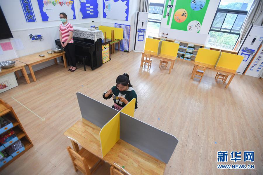 5月8日,在长沙市岳麓幼儿教育集团第二幼儿园,参加模拟演练的老师模拟学生吃饭,桌子上放置就餐隔板。 近日,长沙市各幼儿园为开园做准备,提前清洁消毒和布置教室,部分幼儿园进行开园的模拟演练。长沙市的幼儿园开园起始时间为5月11日,全市幼儿园在5月15日前完成开园。 新华社记者陈泽国摄