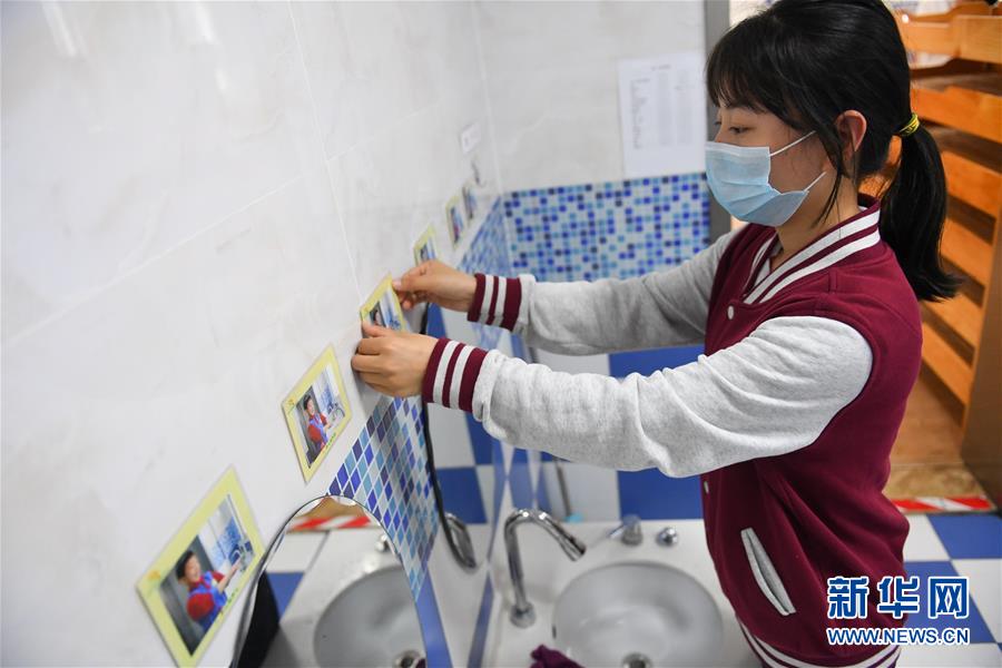 5月8日,在长沙市岳麓幼儿教育集团第二幼儿园,老师布置洗手步骤示意图。 近日,长沙市各幼儿园为开园做准备,提前清洁消毒和布置教室,部分幼儿园进行开园的模拟演练。长沙市的幼儿园开园起始时间为5月11日,全市幼儿园在5月15日前完成开园。 新华社记者陈泽国摄