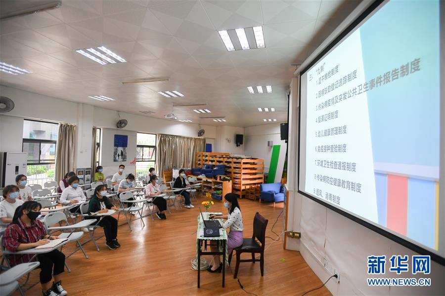 5月8日,在长沙市岳麓幼儿教育集团第二幼儿园,老师进行开学前的培训。 近日,长沙市各幼儿园为开园做准备,提前清洁消毒和布置教室,部分幼儿园进行开园的模拟演练。长沙市的幼儿园开园起始时间为5月11日,全市幼儿园在5月15日前完成开园。 新华社记者陈泽国摄