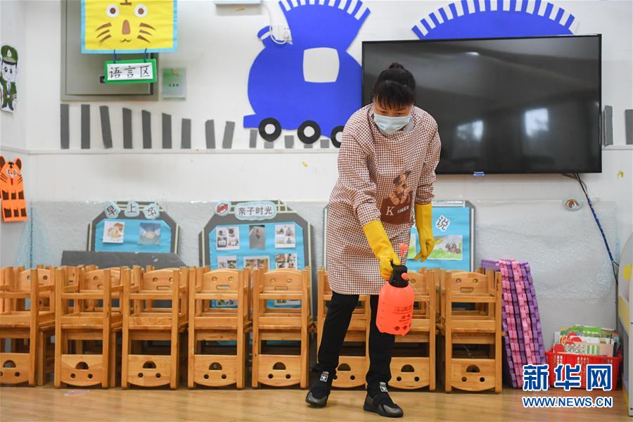 5月8日,在长沙市岳麓幼儿教育集团第二幼儿园,工作人员对教室地面进行清洁消毒。 近日,长沙市各幼儿园为开园做准备,提前清洁消毒和布置教室,部分幼儿园进行开园的模拟演练。长沙市的幼儿园开园起始时间为5月11日,全市幼儿园在5月15日前完成开园。 新华社记者陈泽国摄