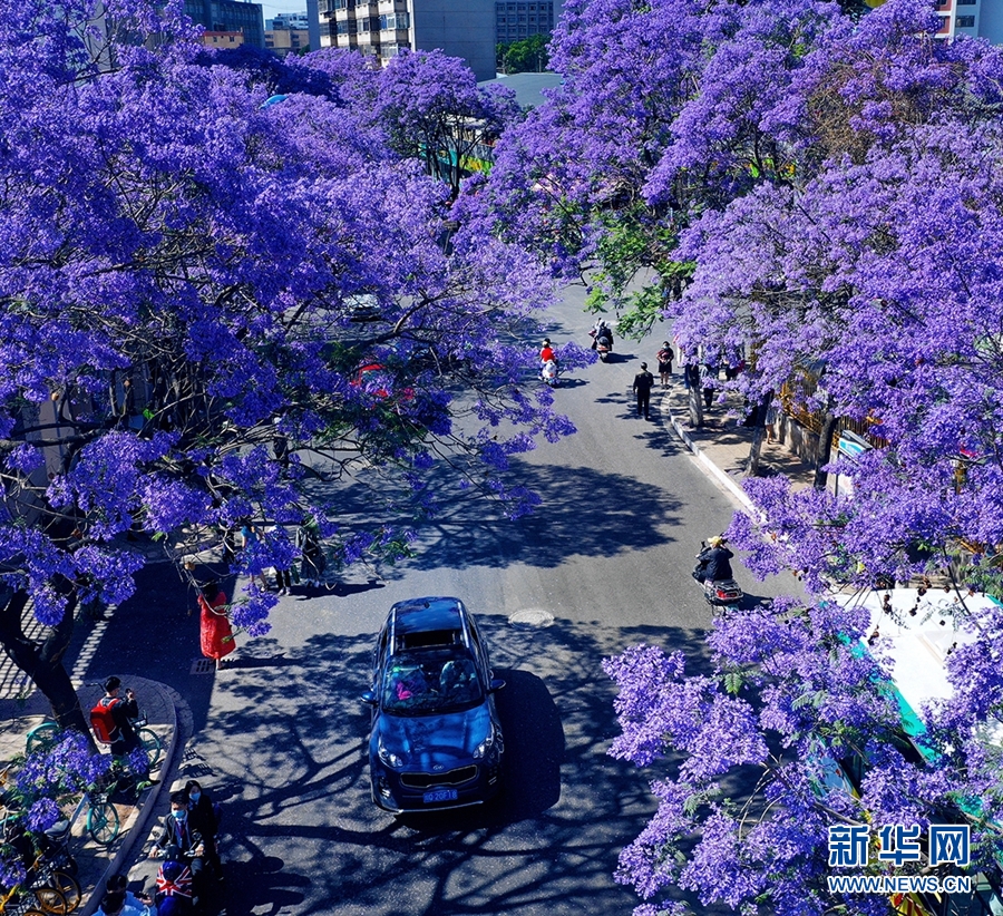 春末夏初,春城昆明的蓝花楹纷纷盛放,蓝紫色的花朵如烟似霞,为这座城市增添了一抹清新与浪漫的色彩。在众多的赏花点中,以教场中路最为壮观,整条道路两旁共种植有250余棵蓝花楹,树树繁花,绵延成一条长约2公里的浪漫花街,被誉为“蓝花楹大道”。今年,这条深受广大市民和游客喜爱的“网红路”,不仅有如期盛放的蓝紫色花海,还新添了以蓝花楹为元素的彩绘墙,以及蓝花楹主题雪糕、丝巾等创意商品。图为5月5日,航拍视角下的“蓝花楹大道”。新华网发(崔永江/摄 念新洪/文)