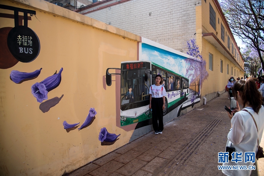 “蓝花楹大道”彩绘墙前,正在留影的游客(5月6日摄)。新华网发(李明/摄)