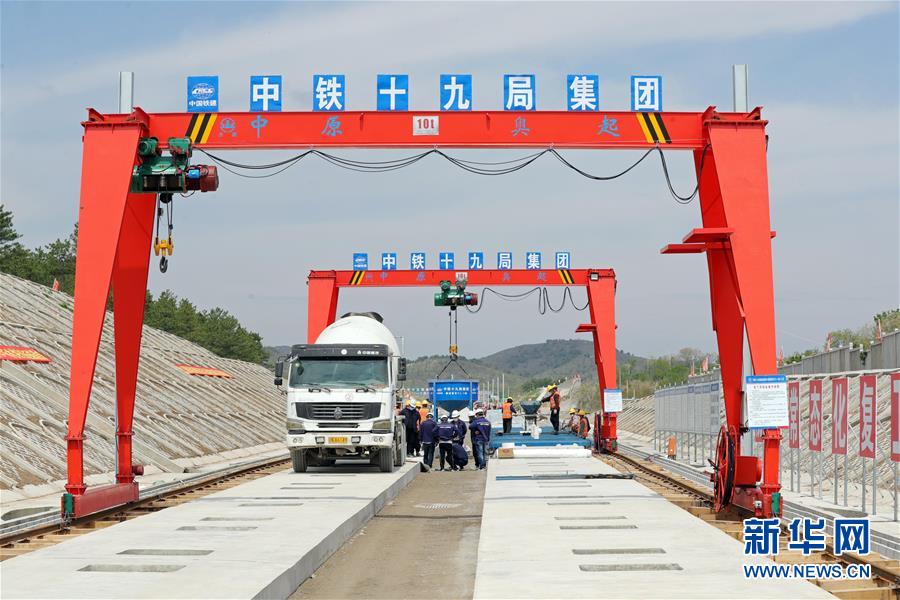 5月9日,中铁十九局工程技术人员准备向无砟轨道板灌注自密实混凝土。新华社记者 杨青 摄