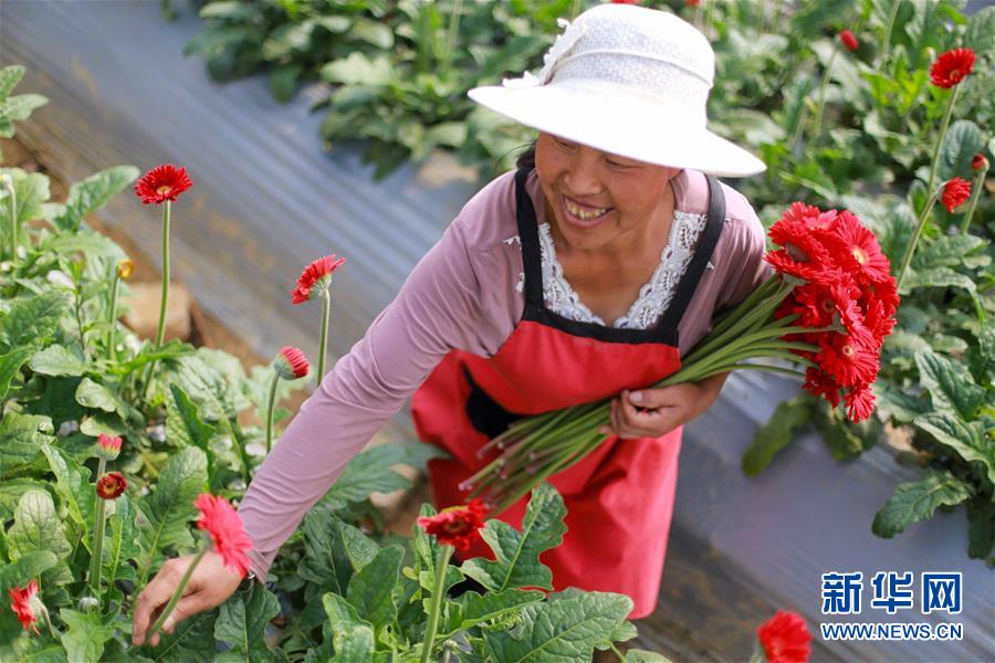 5月9日,在黔西县洪水镇长堰村花卉种植基地,村民在大棚里采摘鲜花,供应市场。新华社发(周训超 摄)