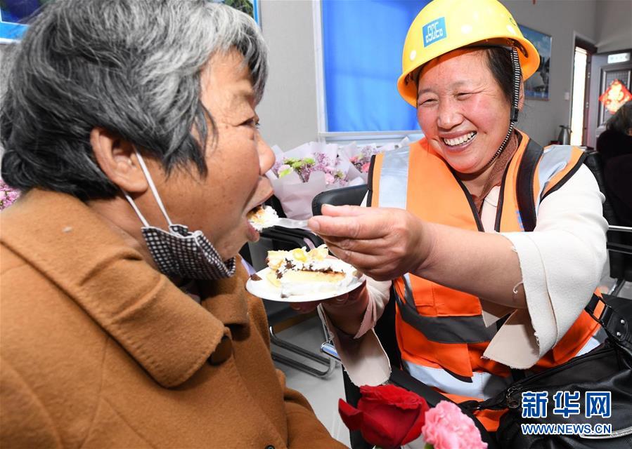 5月9日,在安徽省阜阳市颍泉区沐春苑安置区项目工地上,参加“‘爱’在工地”主题活动的女工张明芳和母亲一起吃蛋糕。 新华社发(王彪 摄)