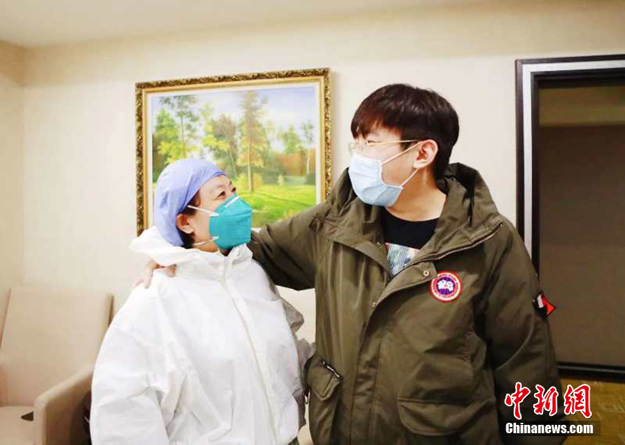 来自妈妈的一封“家书”“宝贝儿子,妈妈很久没有这么称呼你了,可能不习惯吧……”当22岁的许鹤龄看到妈妈杨亚君在湖北荆门沙洋县用会议记录本写的一封“家书”时,瞬间泪奔。年近5旬的杨亚君作为内蒙古呼伦贝尔市一名医护人员,主动请缨赶赴湖北抗击新冠肺炎疫情一线。由于穿着防护服,很多人并不知道杨亚君是一名年近5旬的医护人员,更不知道她的肾还处于重度积水状态。“之所以要这么拼,这么干,我就是想给儿子树立个榜样,当国家有难时,要承担起责任……”杨亚君告诉记者,这也是她在信中告诉儿子“2020年努力做事,认真锻炼”的原因。图为杨亚君赴湖北一线临行前一天和儿子许鹤龄在家中合影。许鹤龄供图