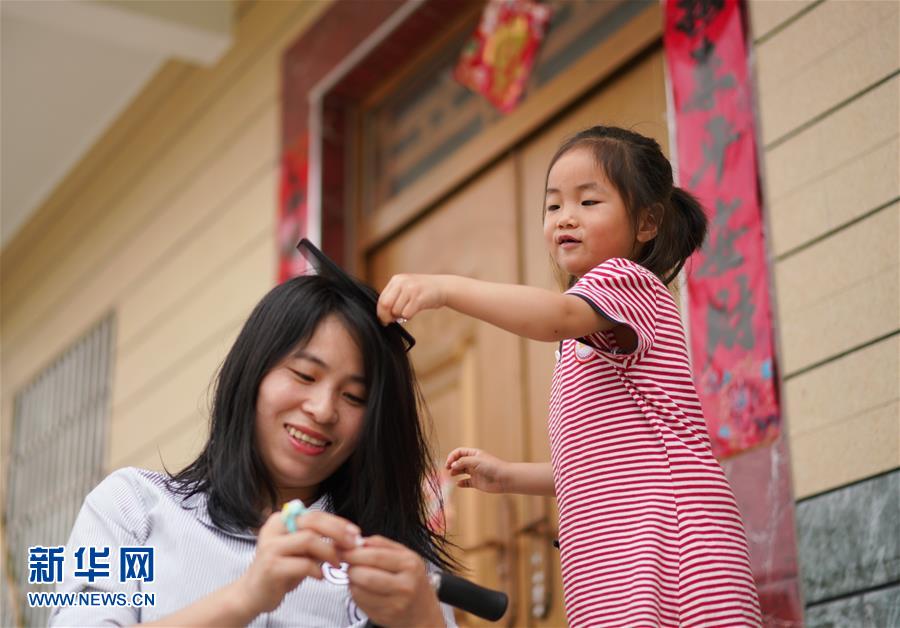 在家门前,女儿但砚文给张海晶梳头(5月8日摄)。