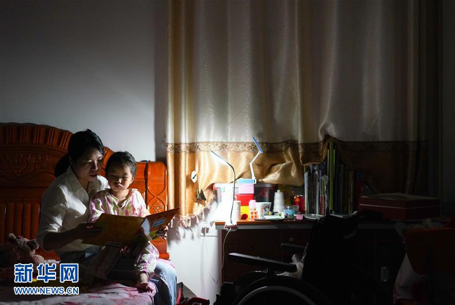 张海晶在家中给女儿讲睡前故事(5月7日摄)。