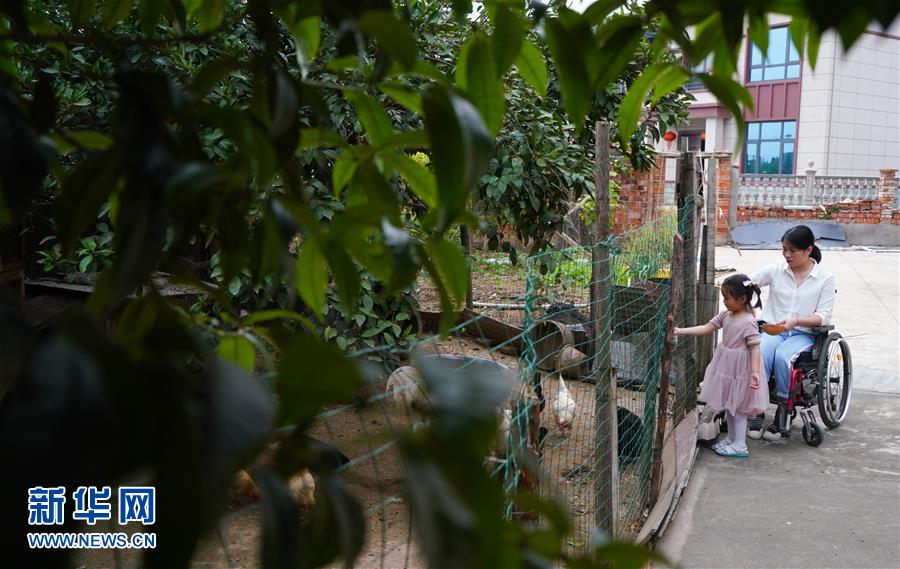 张海晶和女儿在院子里喂鸡(5月7日摄)。