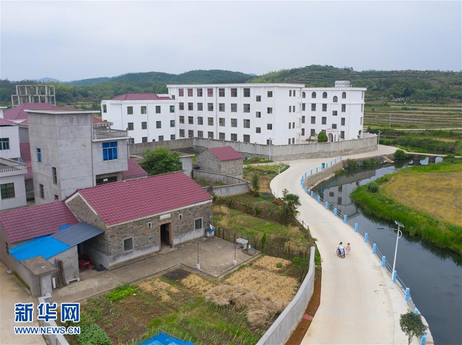 张海晶和女儿走在乡镇的小路上(5月7日摄,无人机照片)。
