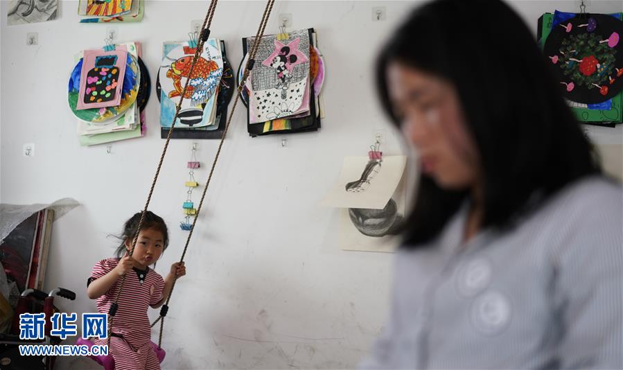 女儿在张海晶的工作室内荡秋千。由于张海晶腿脚不便无法经常出门,为此在工作室内给孩子架了一个秋千,供她玩耍(5月8日摄)。
