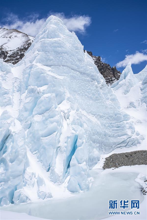 珠峰海拔5800米至海拔6500米的冰塔林(5月9日摄)。 从海拔5800米的珠峰过渡营地到海拔6500米的前进营地,冰塔林沿山谷排列,蔚为壮观。 新华社记者 孙非 摄