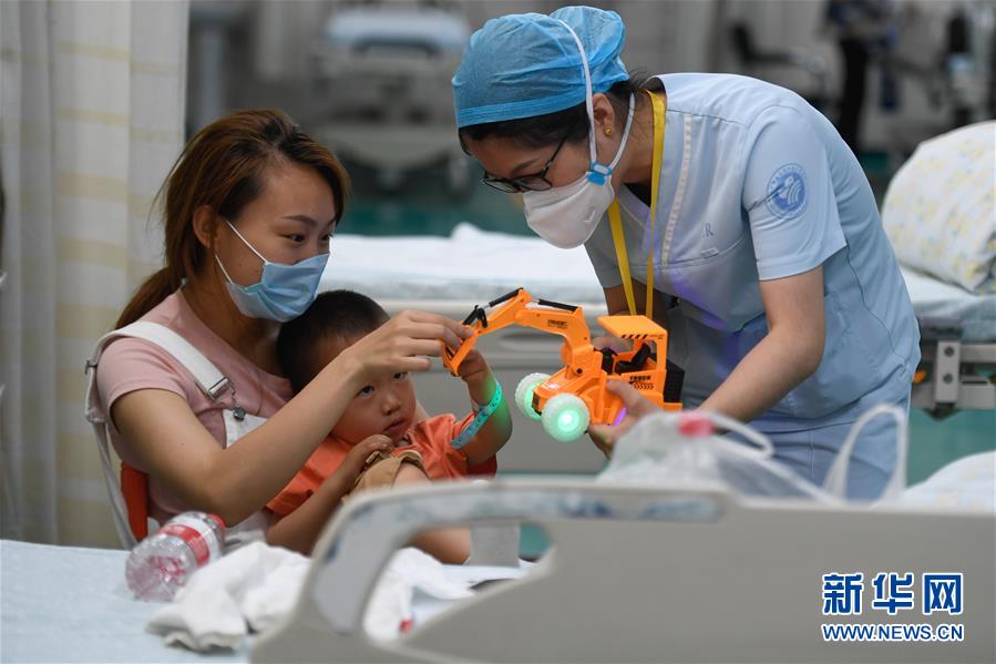 5月11日,浙江大学医学院附属儿童医院急诊科护士何方方(右)拿玩具逗一名小男孩,帮助他平复情绪配合诊治。 国际护士节来临,记者走进浙江省最大的儿科急诊中心——浙江大学医学院附属儿童医院急诊科,用镜头记录急诊科护士们的工作情景。该科室提供24小时不间断医疗救治服务,每年接诊患儿约40万余人次。在急诊科工作,各种紧急状况层出不穷。“事情急、说话急、走路急”,是护士们总结的日常工作状态。不过,当患儿转危为安、家属情绪得以舒缓时,护士们就会从“急”的状态中走出来,迎来最有成就感的时刻。 新华社记者 黄宗治 摄