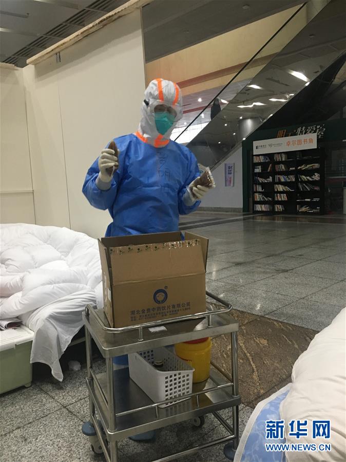 罗明川在武汉江汉方舱医院为患者发放药品(2月10日摄)。