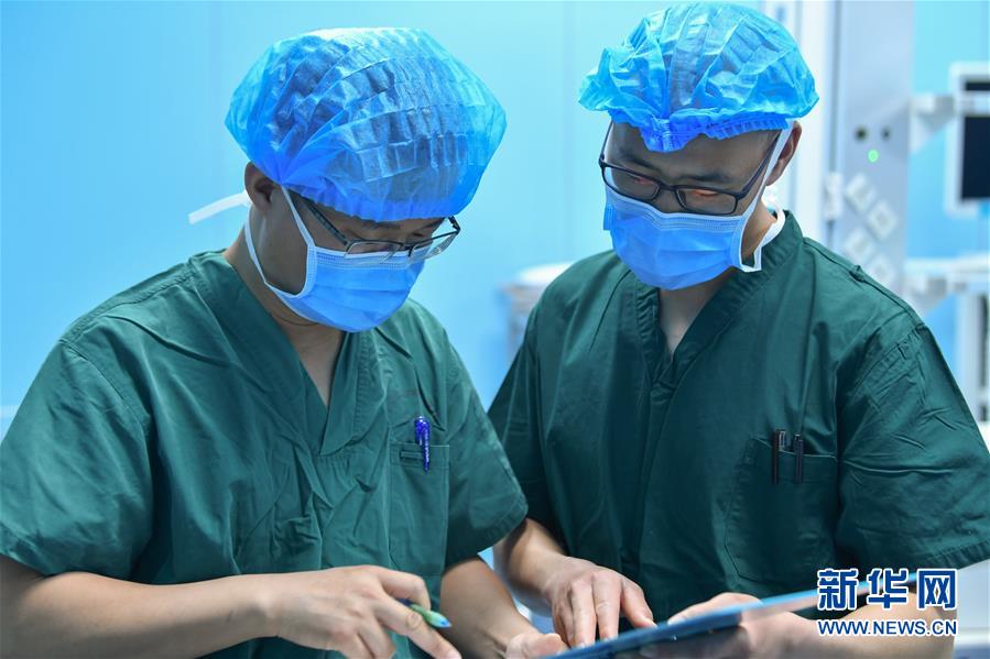 5月11日,罗明川(左)在手术室内与同事一起工作。 新华社记者 魏婧宇 摄