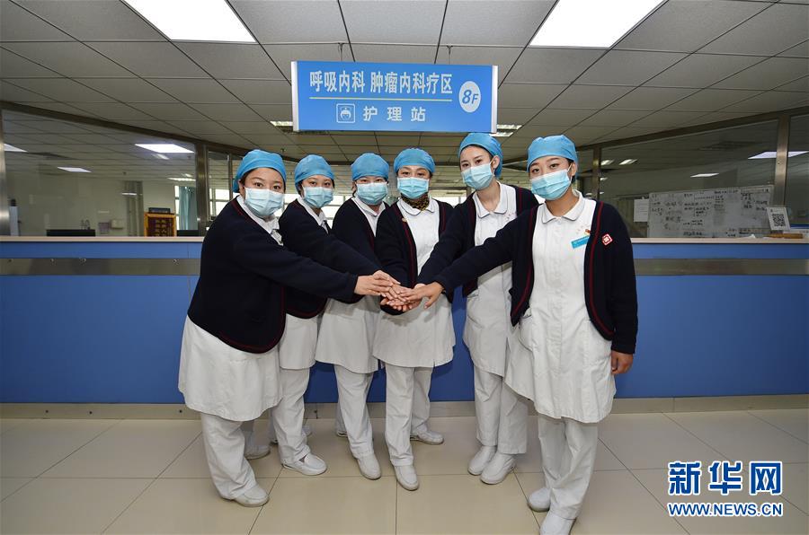 5月11日,长春市人民医院呼吸内科护士许晓秋、邹函书、张静、王玉莲、宫睿阳、李京(从左至右)在呼吸内科合影。 新华社记者 林宏 摄