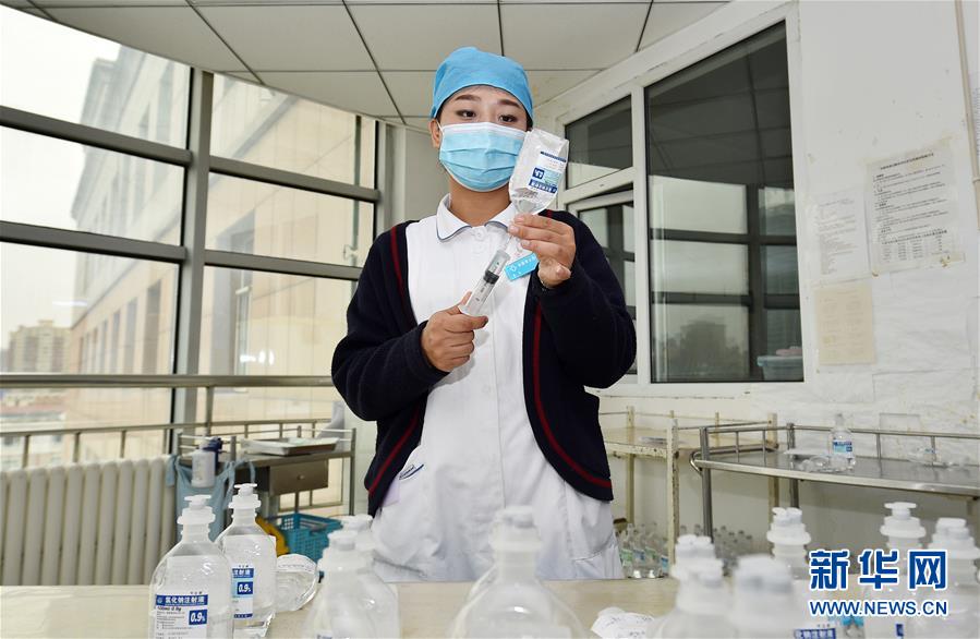 5月11日,长春市人民医院呼吸内科护士李京为给患者注射做准备。 新华社记者 林宏 摄