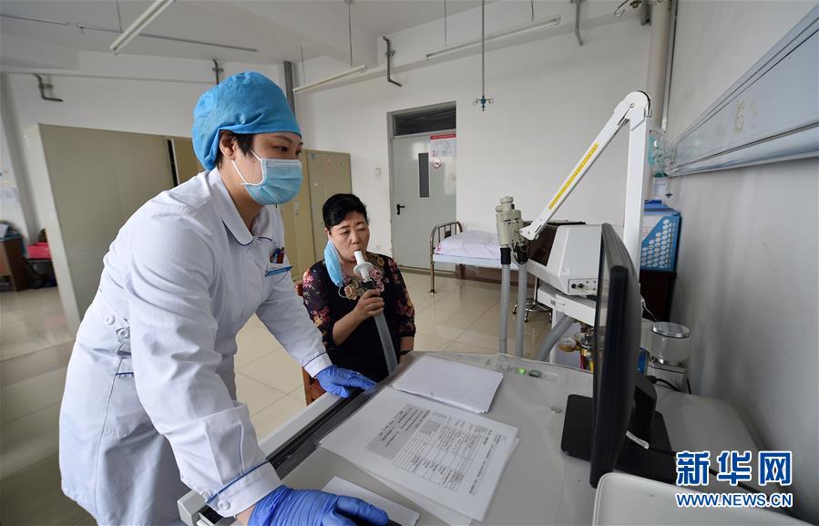 5月11日,长春市人民医院呼吸内科护士邹函书(左)为患者做肺功能检测。 新华社记者 林宏 摄