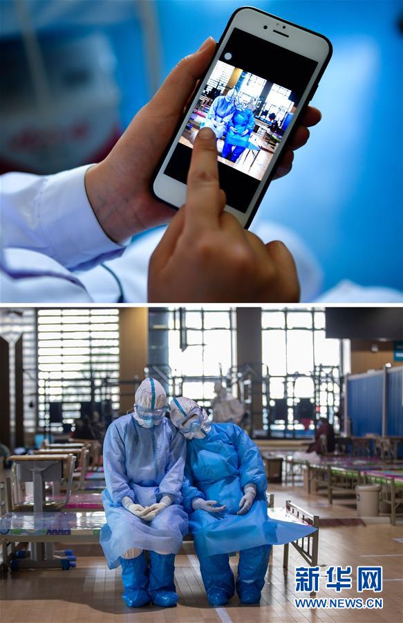 拼版照片:上图为刘海婷在海东市第一人民医院展示手机保存的新华社记者拍摄的照片(新华社记者张龙5月10日摄);下图为在武昌方舱医院,青海医疗队队员刘海婷(左)与许国娟在等待出舱时小憩(新华社记者费茂华3月10日摄)。