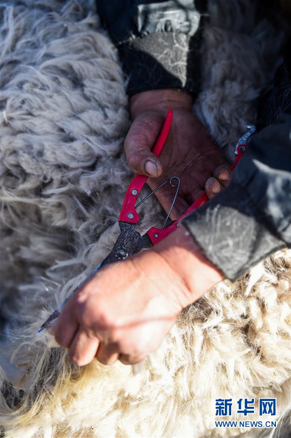 5月11日,内蒙古鄂尔多斯市鄂托克旗棋盘井镇乌仁都喜嘎查的牧民在剪羊毛。 入夏以来,内蒙古鄂尔多斯市鄂托克旗棋盘井镇乌仁都喜嘎查周边的草原迎来剪羊毛、梳羊绒的季节。牧民们将羊群赶到固定地点,用剪刀和抓绒梳为山羊脱掉毛绒“大衣”。 新华社记者 连振 摄