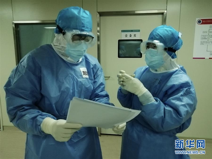在黑龙江省新冠肺炎重症救治中心,哈尔滨医科大学附属第一医院的护士刘浩(左)和同事讨论工作(4月23日摄)。新华社发