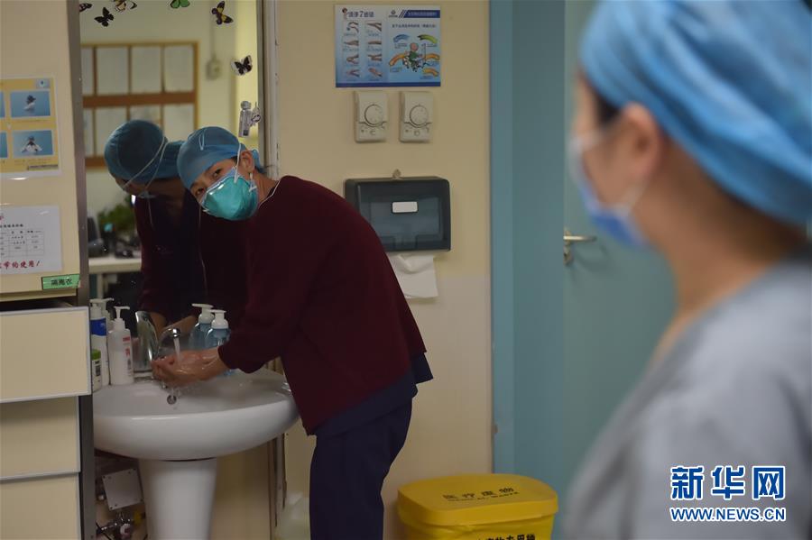 5月11日,在北京地坛医院感染二科护士站,护士高新悦(左)边洗手边和同事沟通病人病情。 北京地坛医院是北京市收治新冠肺炎患者的定点医院之一,医院的医护人员一直奋战在抗击疫情的一线。在国际护士节前夕,记者前往北京地坛医院,记录下抗疫一线护士的日常工作状态。 新华社记者 彭子洋 摄