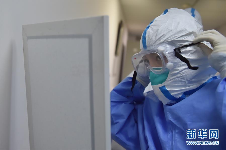 5月11日,在北京地坛医院感染二科病房外,护士刘印怀穿戴防护设备准备进入病房。 北京地坛医院是北京市收治新冠肺炎患者的定点医院之一,医院的医护人员一直奋战在抗击疫情的一线。在国际护士节前夕,记者前往北京地坛医院,记录下抗疫一线护士的日常工作状态。 新华社记者 彭子洋 摄