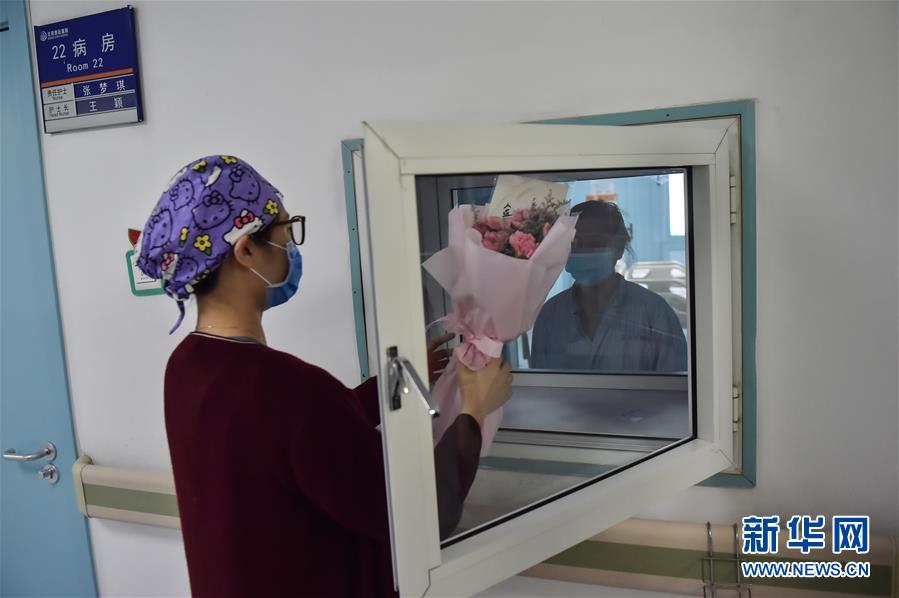 5月11日,在北京地坛医院感染二科病房外,一名护士向病人转交病人女儿送来的鲜花。 北京地坛医院是北京市收治新冠肺炎患者的定点医院之一,医院的医护人员一直奋战在抗击疫情的一线。在国际护士节前夕,记者前往北京地坛医院,记录下抗疫一线护士的日常工作状态。 新华社记者 彭子洋 摄