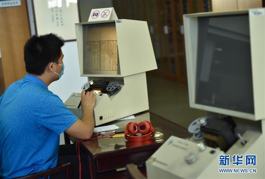 5月12日,在中国国家图书馆,一名读者使用缩微胶卷阅读机阅读古籍。 当日,中国国家图书馆有序恢复开馆,开放区域为国家图书馆总馆南区,实行预约限流入馆。 新华社发(陈钟昊 摄)