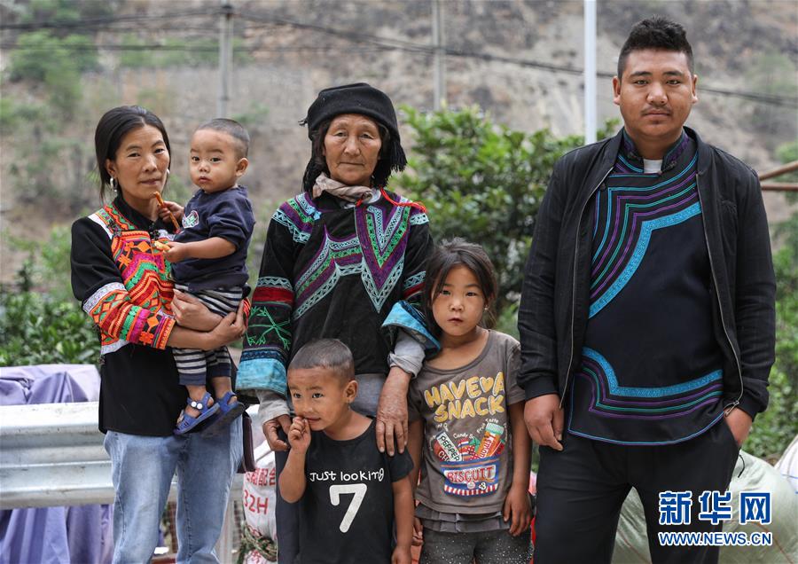 5月12日,四川省昭觉县阿土列尔村第一批26户贫困户开始搬新家,莫色石波一家6口在山下公路边合影留念。
