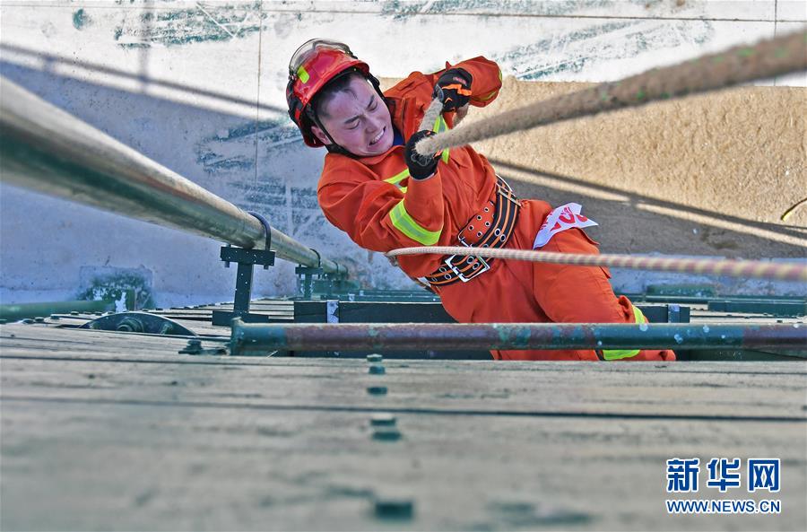 5月12日,在山东省烟台市消防救援支队培训基地,消防员在进行绳索攀爬比赛。 当日是我国第十二个“全国防灾减灾日”,各地开展了形式多样的防灾减灾活动。 新华社发(孙文潭 摄)